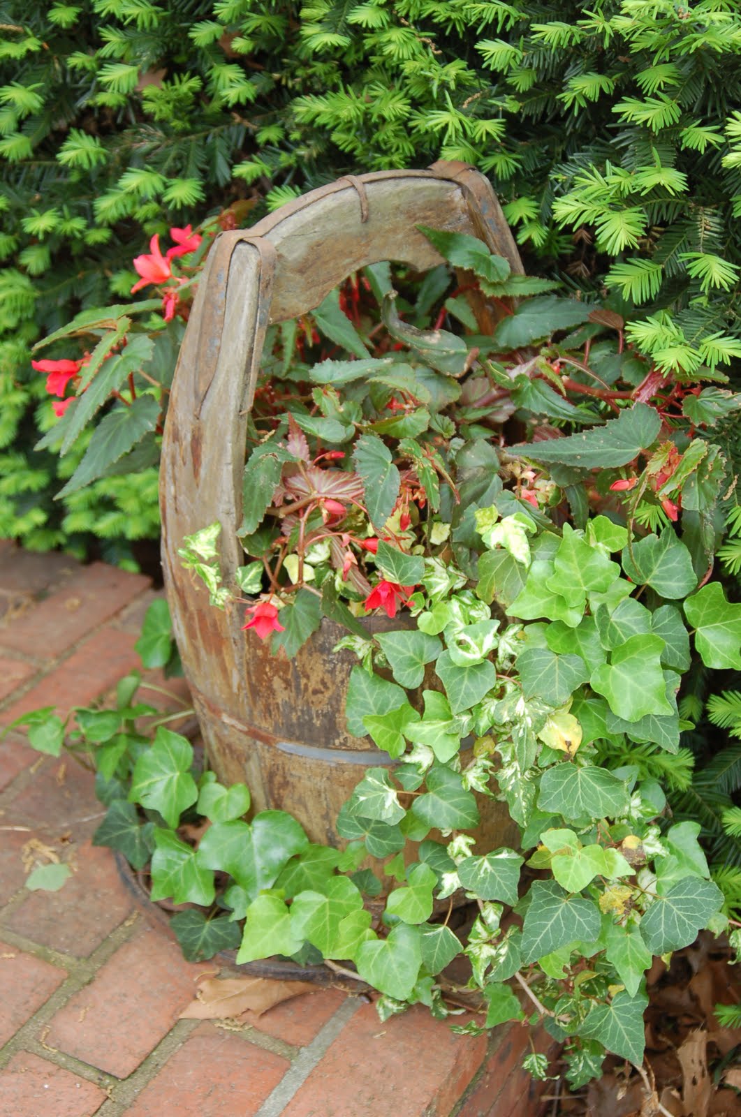 I also had half a hanging basket full of Scarlet bonfire begonia that I added to my "water bucket" planter that already had ivy flowing from it.